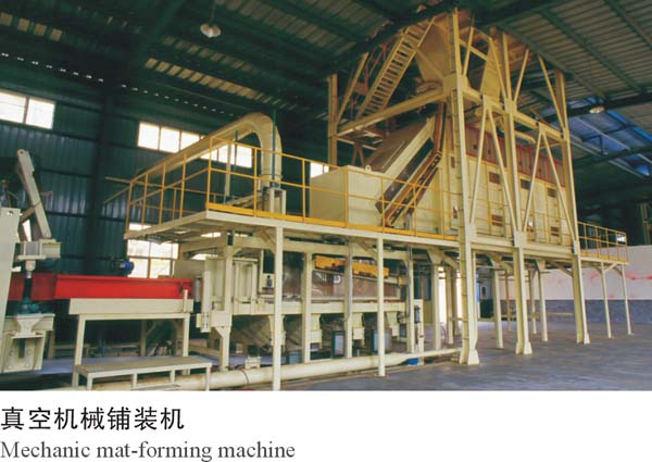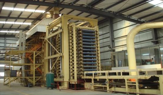 干燥過(guò)的纖維由風(fēng)送系統送入真空機械鋪裝機,通過(guò)拋料輥及鋪裝頭拋灑,均勻落在成型網(wǎng)帶上,網(wǎng)帶下的真空箱可調節負壓使成型板坯密度更加均勻。蓬松的板坯經(jīng)預壓機預壓密實(shí)后,經(jīng)板坯縱、橫截鋸制成符合規格長(cháng)度的板坯,然后經(jīng)鋸邊運輸機、加速皮帶運輸機、貯板運輸機、伸縮式運輸機等連續運輸后送至裝板機,裝板機逐層裝完板坯后,裝板機內的小車(chē)將懸臂傳送帶連同板坯一道進(jìn)入熱壓機,在送進(jìn)過(guò)程中傳送帶前端的鏟頭將已壓好的纖維板同時(shí)推出去,當小車(chē)到達終點(diǎn)時(shí),纖維板已全部進(jìn)入卸板機,而板坯也到達預定位置,此時(shí)小車(chē)后退,同時(shí)皮帶向前運轉,在傳送帶的線(xiàn)速度與小車(chē)后退速度相等時(shí),板坯處于相對靜止,從而被留在熱壓板上。板坯在熱壓機的溫度和壓力作用下,壓制成規定的厚度,并使內部膠粘劑固化,從而制成具有一定強度的板材。壓制后由卸板機將其成板卸至托架,在吊籠逐層下降時(shí)由出板機構逐塊卸出,運至下一工序。熱壓后的毛板經(jīng)過(guò)冷卻翻板機自然冷卻后由縱橫鋸邊機、橫向鋸邊機鋸邊后堆垛。