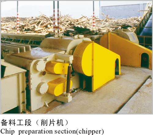 原料經(jīng)過(guò)削片機切削成一定規格的木片至料倉貯存,經(jīng)過(guò)篩選將木片中的細屑、泥土及砂石等雜質(zhì)清除。