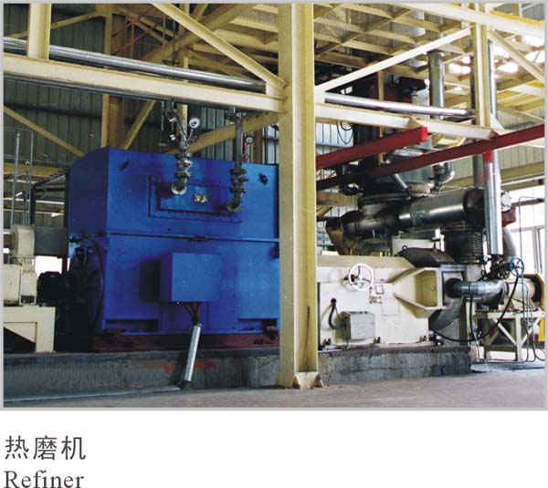 3、調供膠工段 我們采用的是先施膠后干燥工藝。熔融石蠟或其他防水劑直接送入熱磨機,在兩磨盤(pán)的擠壓和揉搓下、石蠟均勻地與纖維混合在一起。膠粘劑在一定壓力下經(jīng)管道輸送到熱磨機纖維噴放管中與纖維進(jìn)行充分混合。