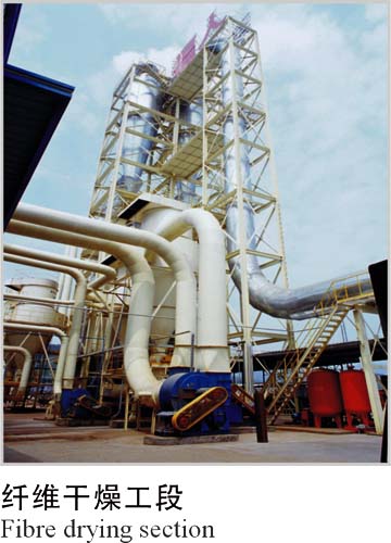 施過(guò)膠的纖維隨熱磨機的蒸汽由噴放管?chē)娙敫稍锕?,然后由高溫的熱風(fēng)以正壓氣力輸送方式將濕纖維沿干燥管道風(fēng)送到旋風(fēng)分離器,輸送過(guò)程中在熱風(fēng)的作用下纖維中的水份隨之蒸發(fā),干燥后的纖維與含有水蒸汽的空氣在旋風(fēng)分離器中進(jìn)行分離后,送入干纖維料倉儲存。